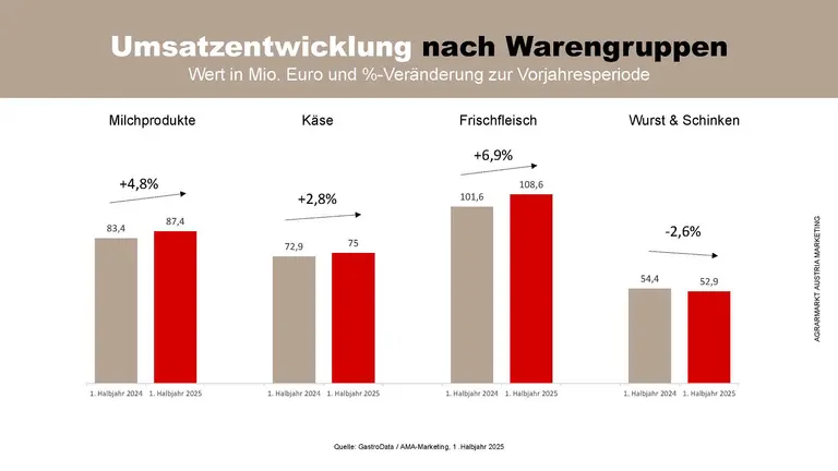 Der österreichische Gastronomiegroßhandel konnte im ersten Halbjahr 2025 über alle Sortimente hinweg ein Umsatzplus von 2,4 Prozent erzielen. Besonders positiv entwickelten sich die AMA-Warengruppen: Der Umsatz stieg von 409,9 Mio. Euro auf 427,2 Mio. Euro – ein Zuwachs von 4,2 Prozent. Auch der Absatz legte zu und erreichte 119,9 Mio. kg, was einem Plus von 2,7 Prozent entspricht.